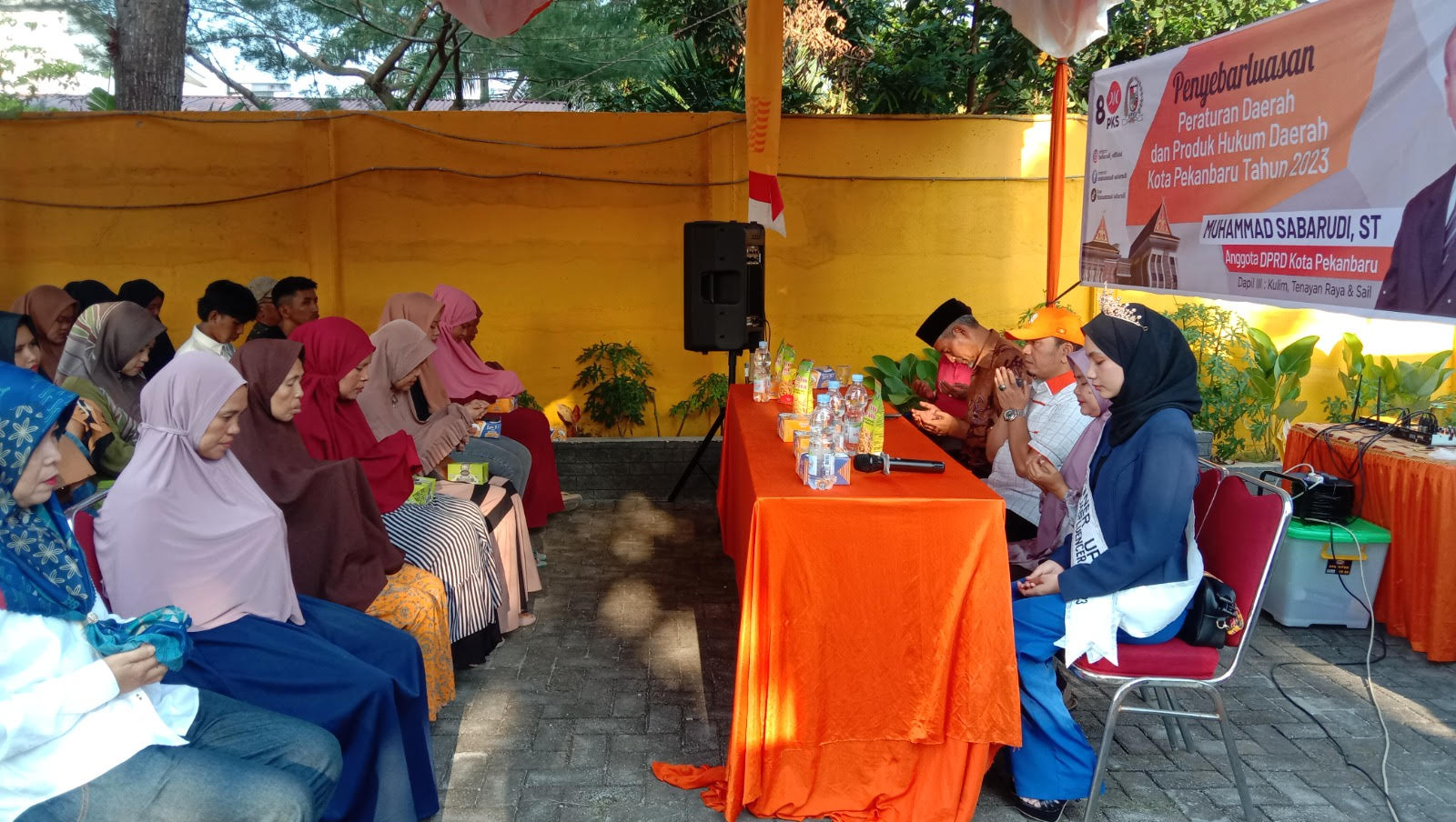 PEKANBARU, LIPO - Ketua DPRD Kota Pekanbaru M Sabarudi ST melaksanakan Sosialisasi Peraturan Daerah (Perda) yang ada di Kota Pekanbaru, di daerah pemilihannya. Kegiatan ini dilaksanakan di Jalan Kenanga RT 01 RW 02, Kelurahan Mentangor, Kecamatan Kulim, pada Sabtu (16/9/2023).