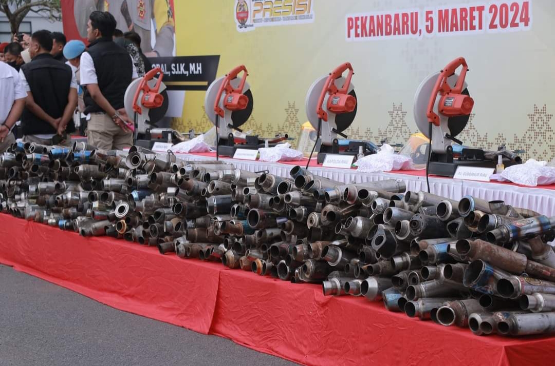 Polda Riau juga melakukan pemusanahan knalpot brong hasil penertiban.