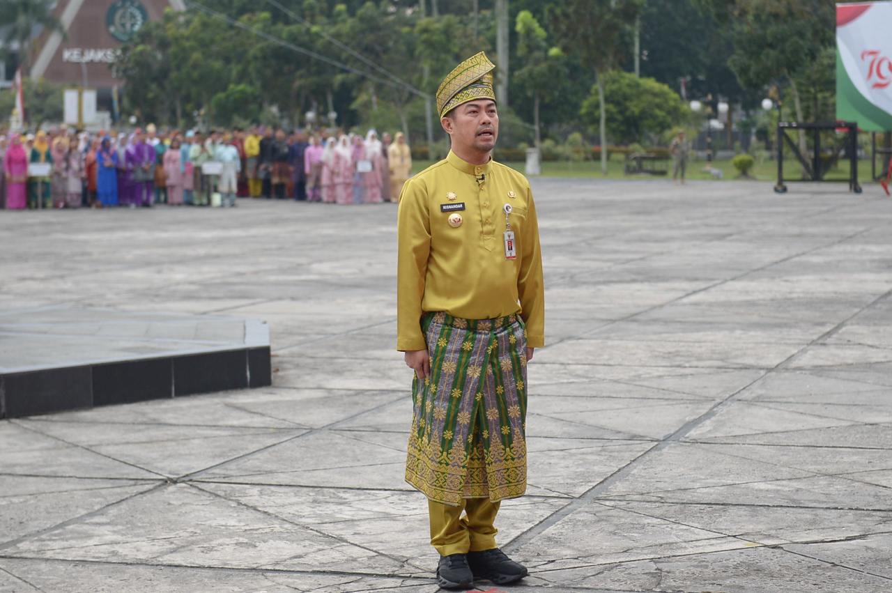 PEKANBARU, LIPO - Penjabat (Pj) Gubernur Riau SF Hariyanto menjadi inspektur upacara Hari Ulang Tahun (HUT) Ke-67 Provinsi Riau di Halaman Kantor Gubernur, Jumat (9/8/2024).