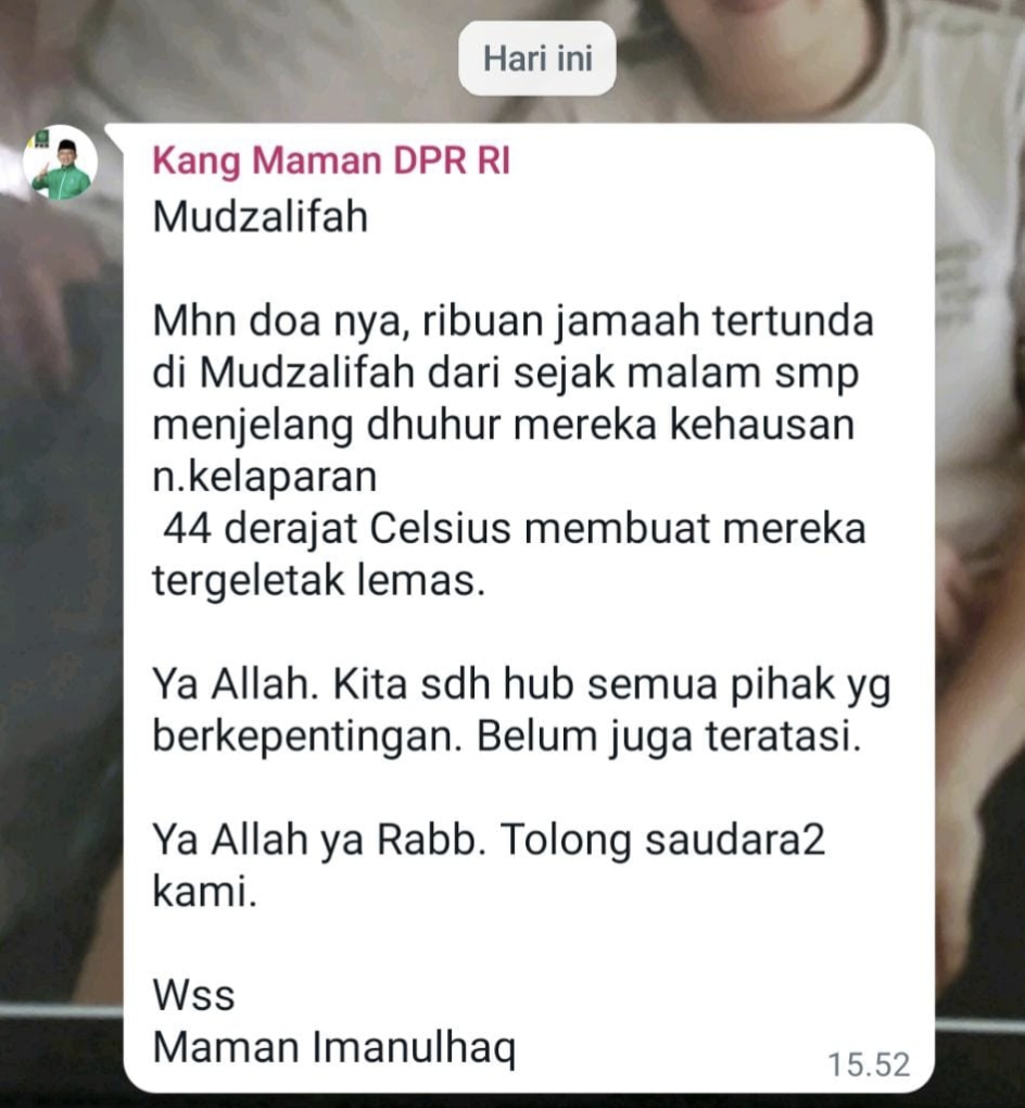 "Mohon doanya, ribuan jemaah tertunda di Mudzalifah dari sejak malam sampai menjelang dzuhur, mereka kehausan dan kelaparan," tulis Wakil Sekretaris Dewan Syuro DPP PKB, Rabu (28/6/2023).