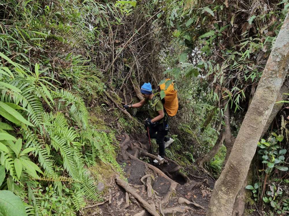 Perjalanan ke shelter 3 ini semua kemampuan harus dikerahkan, tidak hanya kekuatan kaki, juga kekuatan tangan untuk bergelayutan di akar pohon di tebing nan curam.