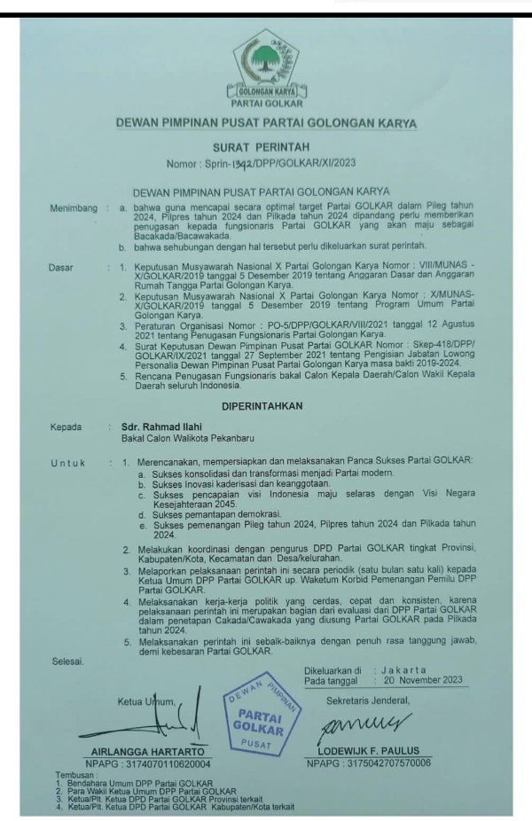 Dalam Surat tersebut dikatakan, bahwa guna mencapail secara optimal target Partai GOLKAR dalam Pemilihan Legislatif (Pileg) tahun 2024, Pilpres tahun' 2024 dan Pilkada tahun 2024 dipandang perlu memberikan