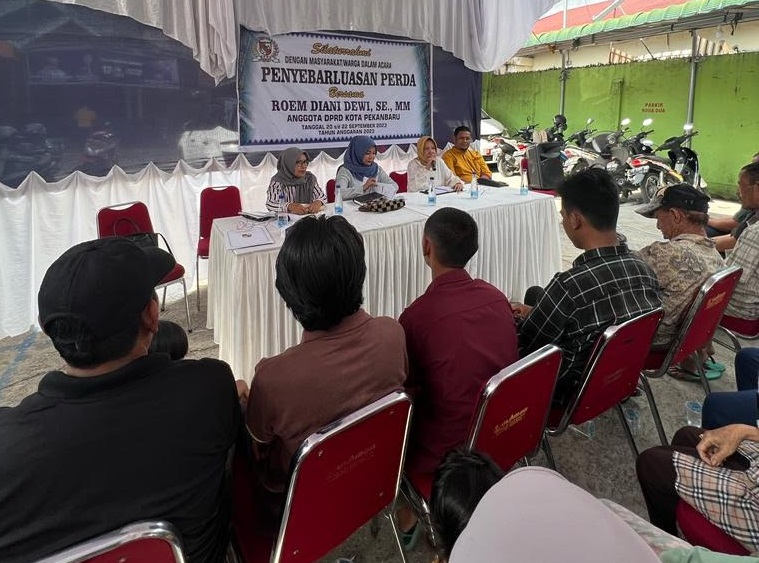 PEKANBARU, LIPO - Anggota DPRD Kota Pekanbaru Roem Diani Dewi dari Partai Demokrat melaksanakan penyebarluasan Perda kota Pekanbaru pada Jumat (22/9/2023) sore di Jalan Kamboja gang Dakwah RT 02 RW 02 Kelurahan Sukajadi Kecamatan Sukajadi.