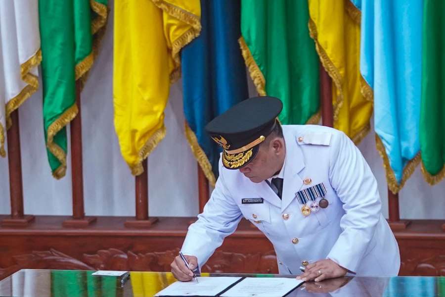 Usai dilakukan pengambilan sumpah jabatan, dilanjutkan dengan penandatanganan berita acara pelantikan Pj Gubernur Riau oleh SF Hariyanto dan Mendagri, Tito Karnavian.