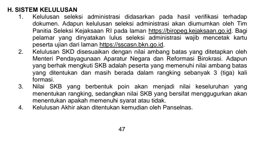 “Para PNS yang lulus seleksi akan ditempatkan di Kejaksaan Agung, Kejati, dan Rumah Sakit Adhyaksa,” demikian dikutip liputanoke.com pada lembaran surat pengumuman, pada Selasa (20/08/24) .