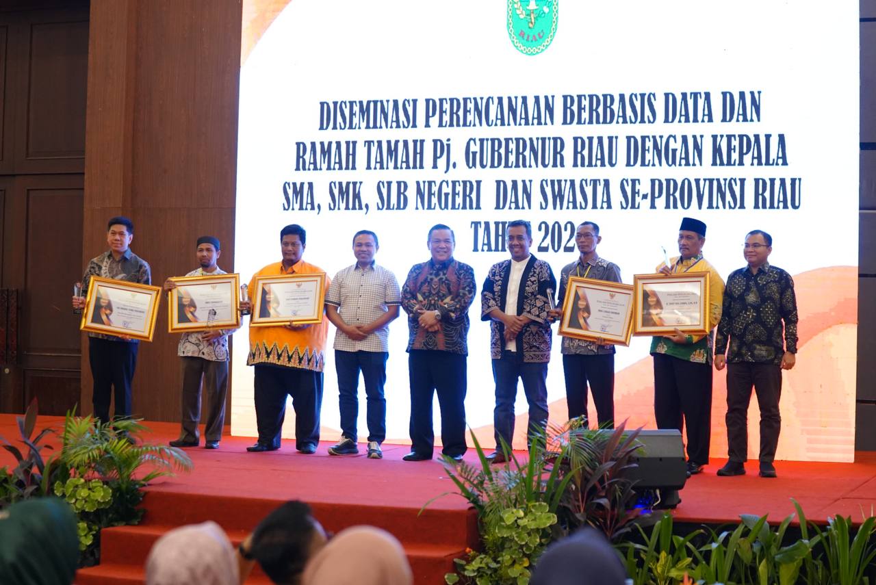 Penghargaan ini diserahkan Pj Gubri saat menghadiri diseminasi perencanaan berbasis data yang diikuti oleh Kepala Sekolah (Kepsek) SMA, SMK, SLB negeri dan swasta se-Provinsi Riau. Acara ini diselenggarakan di Hotel Aryaduta Pekanbaru, Kamis (11/7/2024).