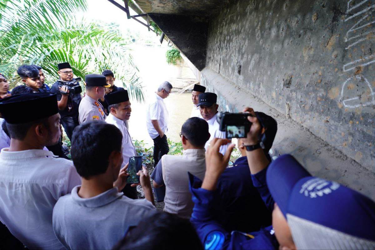 Kondisi tiang jembatan yang miring saat Gubernur Riau H Abdul Wahid melakukan peninjauan.