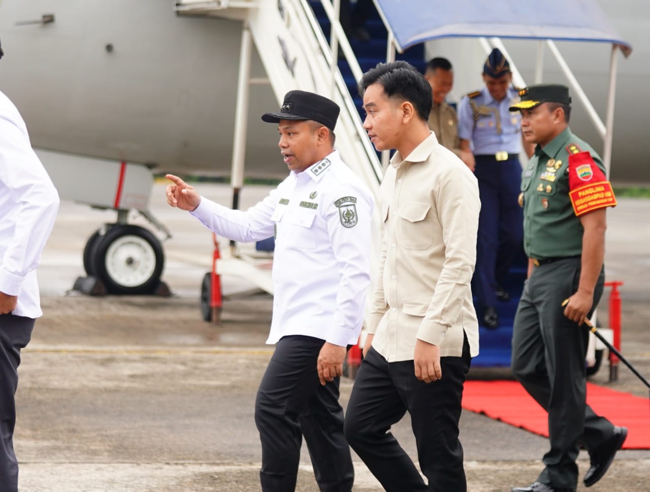 Wapres Gibran Rakabuming Raka disambut Gubri Abdul Wahid dalam kunjungan kerjanya ke Pekanbaru.