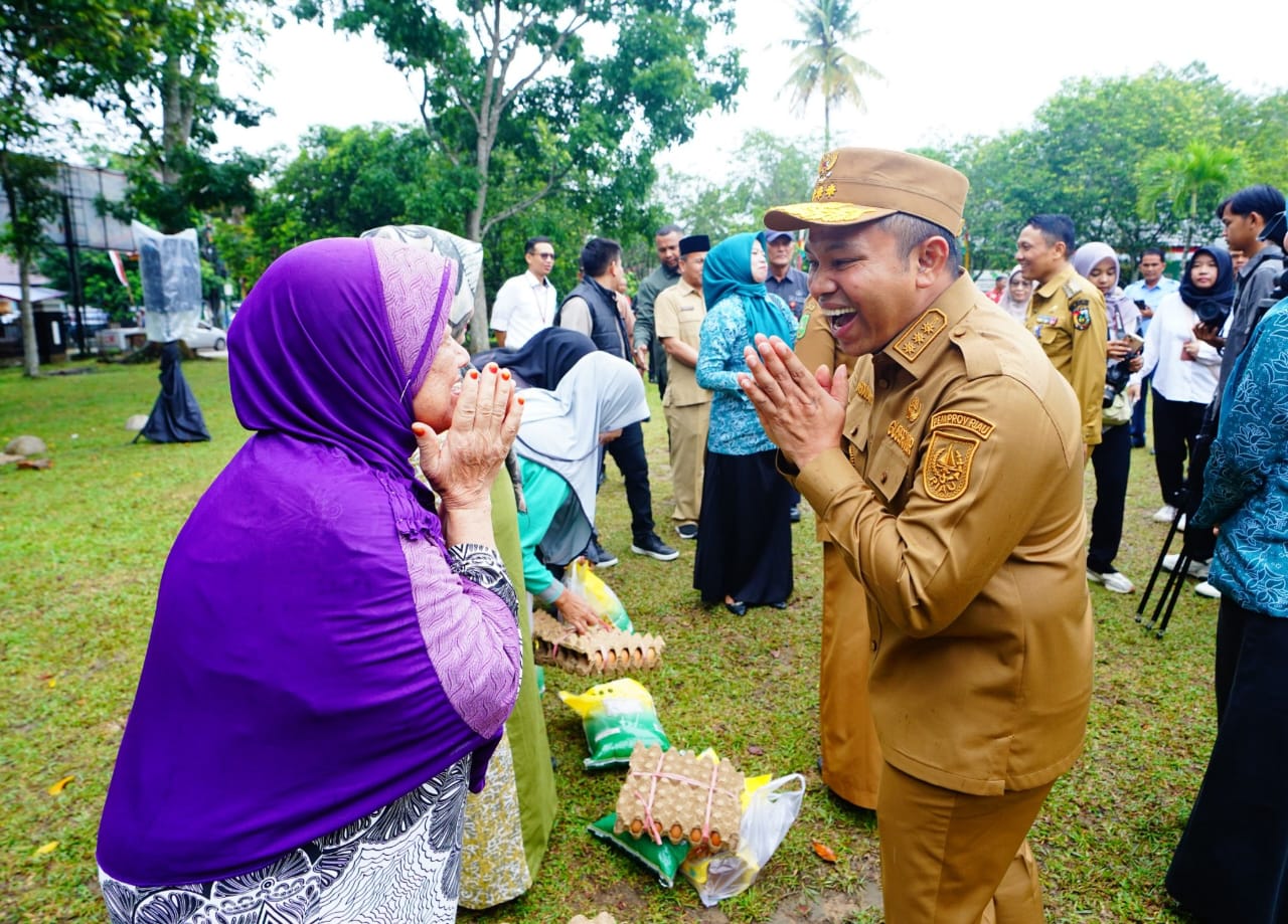 Gubri Abdul Wahid menyalami warga saat menghadiri acara pasar murah.