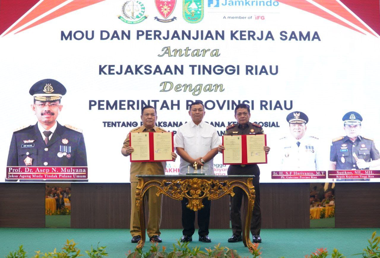 PEKANBARU, LIPO - Pemerintah Provinsi Riau bersama Kejaksaan Tinggi Riau resmi menandatangani Nota Kesepahaman terkait pelaksanaan pidana kerja sosial bagi pelaku tindak pidana ringan. MoU antara Kejaksaan Negeri dan Pemerintah Kabupaten/Kota se-Provinsi Riau juga digelar sebagai langkah teknis dalam mendukung implementasi kebijakan.